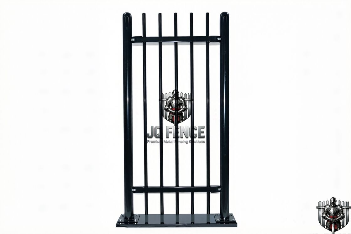 150x150x5 мм Верх и низ стальной ограды превышают рельс на 150/200 мм. |